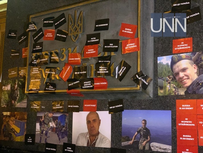 На будівлю Офісу Зеленського активісти прикріпили фото загиблих захисників Батьківщини та наліпки з гаслами проти капітуляції
