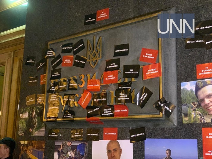 Як «нагадування» активісти вирішили обліпити стіни Офісу президента України наліпками із різними повідомленнями: «Ми - це Україна», «Донбас - це Україна», «Ні формулі Штайнмаєра», «Слава Україні», «Ні - капітуляції», «Росія - це ворог» та ін.