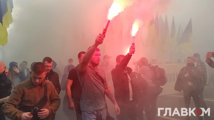 «Ні капітуляції!». Ветерани АТО і націоналісти у центрі Києва запалили фаєри