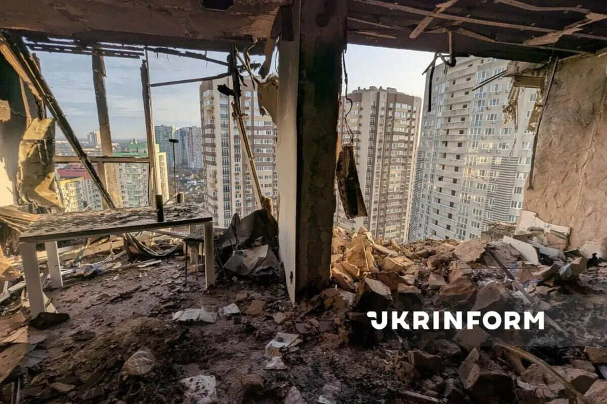 Влучання внаслідок масованої атаки РФ сталося у Дніпровському районі Києва. Через це було зруйновано багатоповерхівку. На фото видно, що на деяких поверхах будинку повністю відсутні стіни, залишилися лише опори. Квартири киян зруйновані та понівечені.