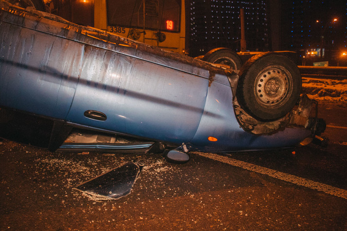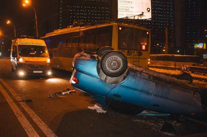 Водій Daewoo рухався по Повітрофлотському мосту і збирався виїхати на проспект Перемоги. Він не помітив електричний кабель, який звисав на дорогу. Машина зачепилася за нього і перекинулася. У польоті авто зачепило тролейбус і обірвало його проводи. Частина бампера Daewoo виявилася на даху громадського транспорту.