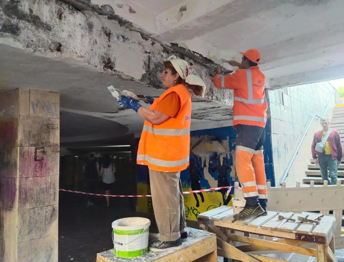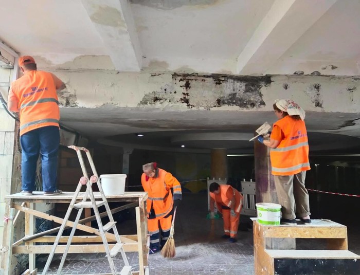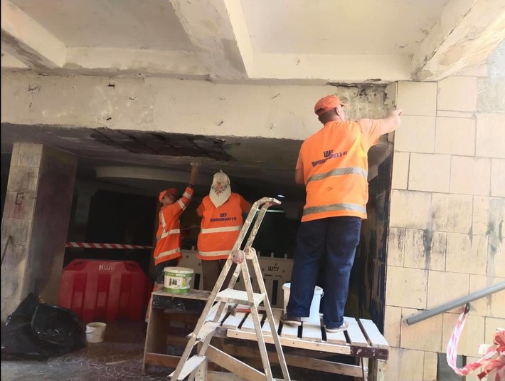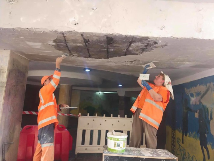 Зазначається, що в підземному переході комунальники проводять ремонтні роботи, які тривають протягом декількох днів. У ході робіт у переході знімають захисний шар бетону, а також штукатурку, самі роботи проводять планово.