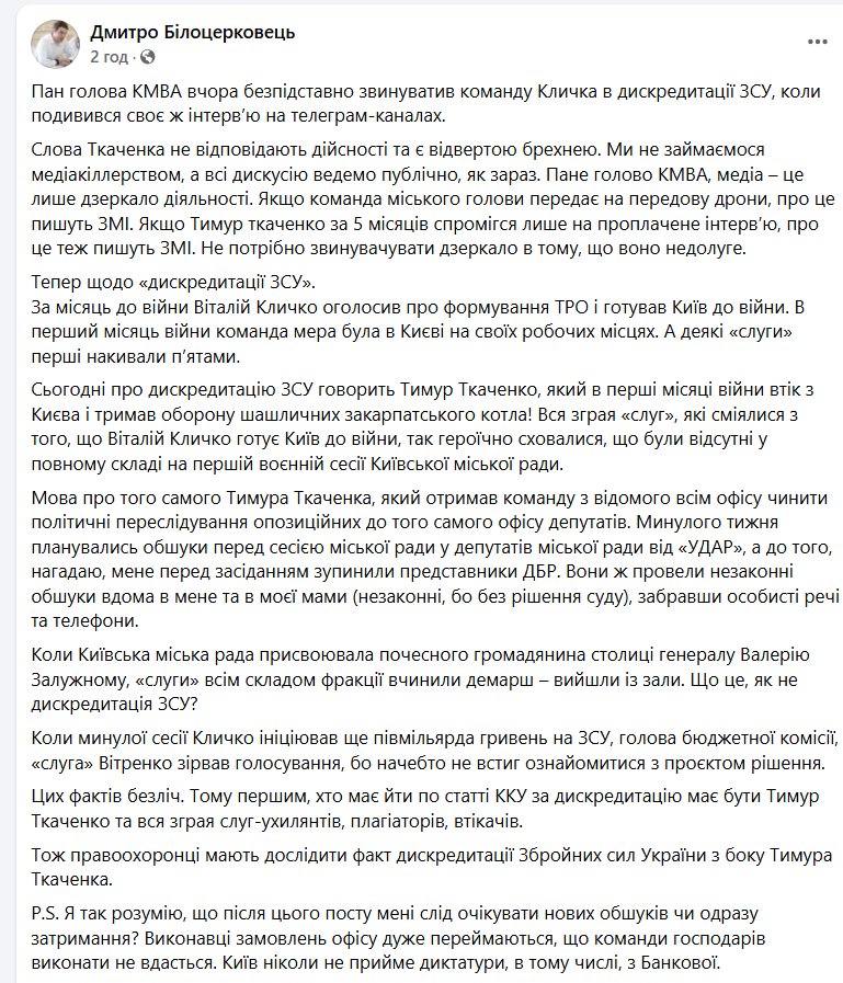 Щодо «дискредитації ЗСУ» Білоцерківець повідомив, що за місяць до війни Віталій Кличко оголосив про формування ТРО і готував Київ до війни. В перший місяць війни команда мера була в Києві на своїх робочих місцях. А деякі «слуги», за словами радника Кличка, «перші накивали п’ятами».