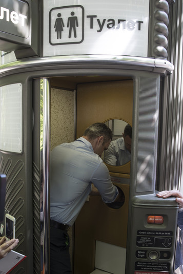 До Поштової площі Віталій Кличко спустився фунікулером. Біля верхнього виходу мер оглянув першу встановлену в Києві автоматичну вбиральню. Вона стилізована під старовинну тумбу для афіш і не псує зовнішнього вигляду міста. Втілювати проект допомагають французькі фахівці.