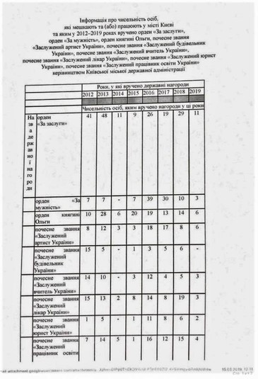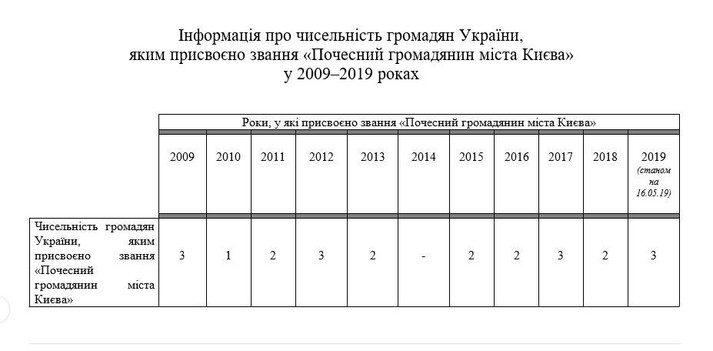 Він також повідомив, що лідером за чисельністю привласнених титулів і відзнак став 2016 рік. Тоді звання і нагороди, в тому числі статус почесного жителя столиці, отримали 160 мешканців Києва.