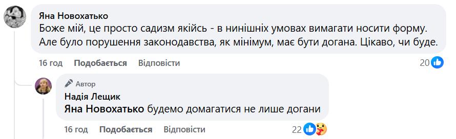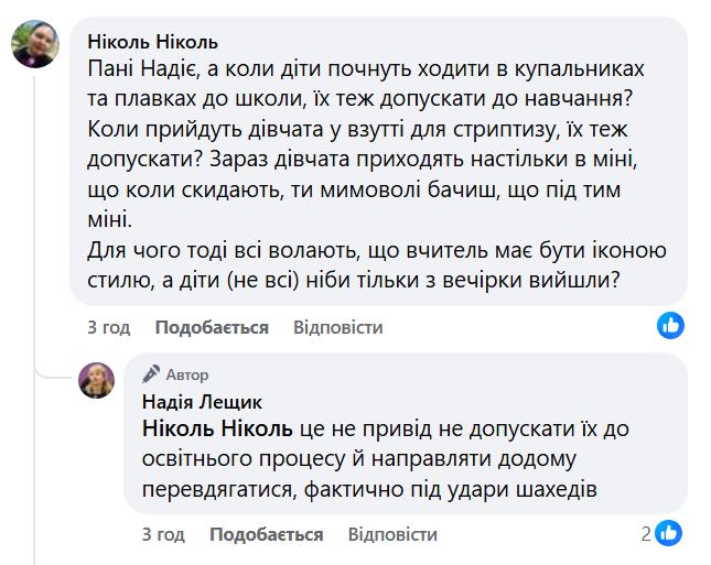 «Наголошую, що відсторонення від занять і направлення дитини для переодягання під час освітнього процесу (у частині областей навчальний рік розпочався з тривалих повітряних тривог) не лише порушує її право на освіту, а й призводить до загрози життю та здоров'ю дитини. Тому закликаю педагогів та адміністрацію закладів освіти припинити заходи щодо перевірки одягу учнів та зосередити увагу на питаннях їх безпеки та інших важливих питаннях. Звертаю увагу, що саме та людина, яка «примусила» учня залишити заклад освіти через одяг, несе в цей час відповідальність за його життя та здоров'я», – зазначила Лещик і пообіцяла, що буде вживати відповідних заходів реагування і домагатися, аби директорка не відбулася лише доганою.