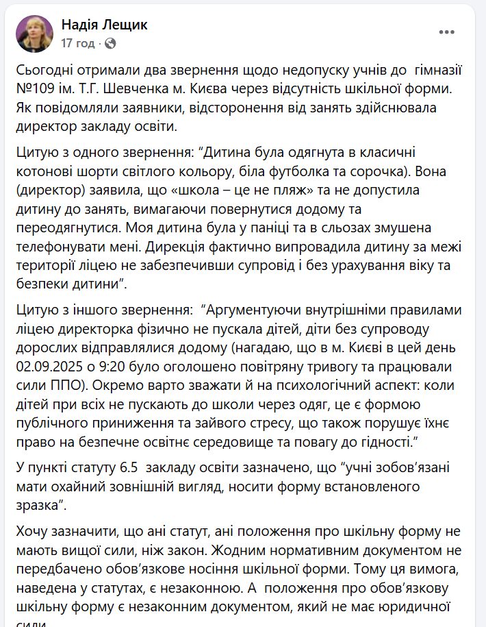 За словами Лещик, такі дії є не лише незаконними, але й такими, що становлять реальну загрозу життю і здоров’ю дітей. Омбудсменка підкреслила, що вимога носити шкільну форму не має юридичної сили, адже жоден закон цього не передбачає. Вона закликала адміністрації освітніх закладів зосередитися на безпеці учнів, а не на контролі їхнього одягу.