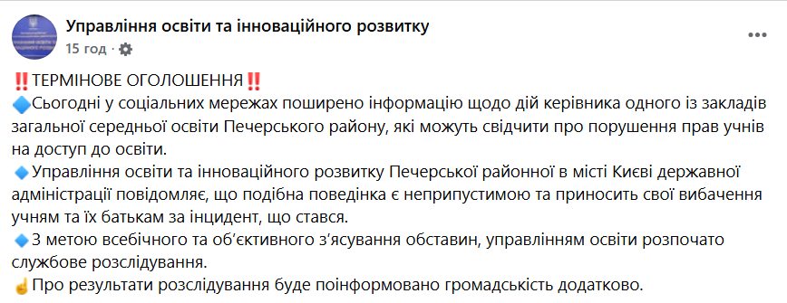 Управління освіти Печерської районної адміністрації назвало поведінку керівника гімназії неприпустимою та вибачилося перед батьками. Там повідомили, що вже розпочато службове розслідування, результати якого обіцяють оприлюднити найближчим часом.