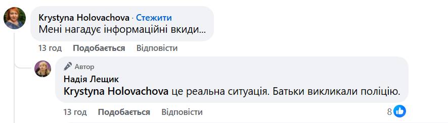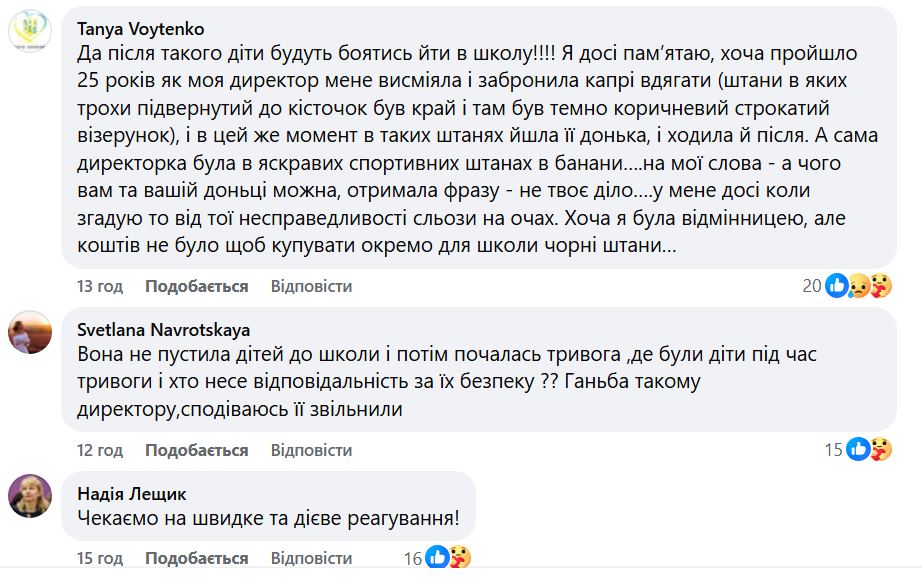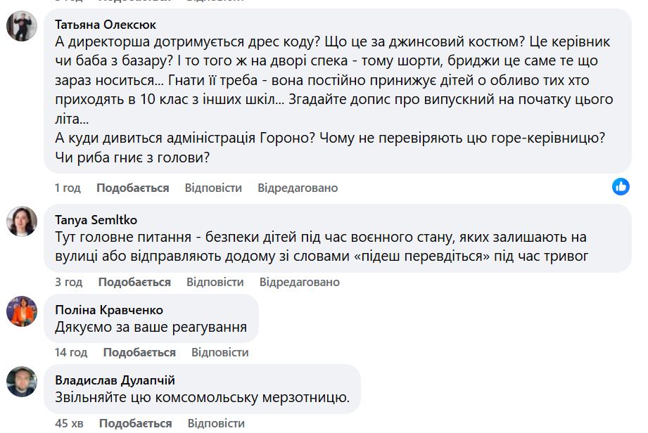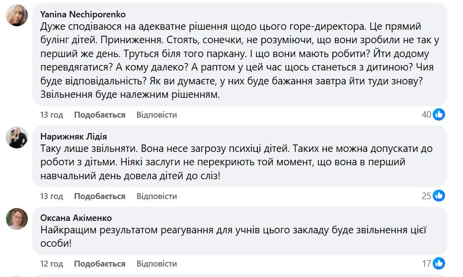 У коментарях під публікацією омбудсмена батьки вимагають звільнення керівниці ліцею і наголошують, що такі педагоги не мають права працювати з дітьми. Одна з матерів розповіла, що її 10-річний син після інциденту відмовляється повертатися до школи. Інші зауважують, що приниження дітей на очах у всього класу створює додатковий психологічний тиск, який під час війни є особливо небезпечним.