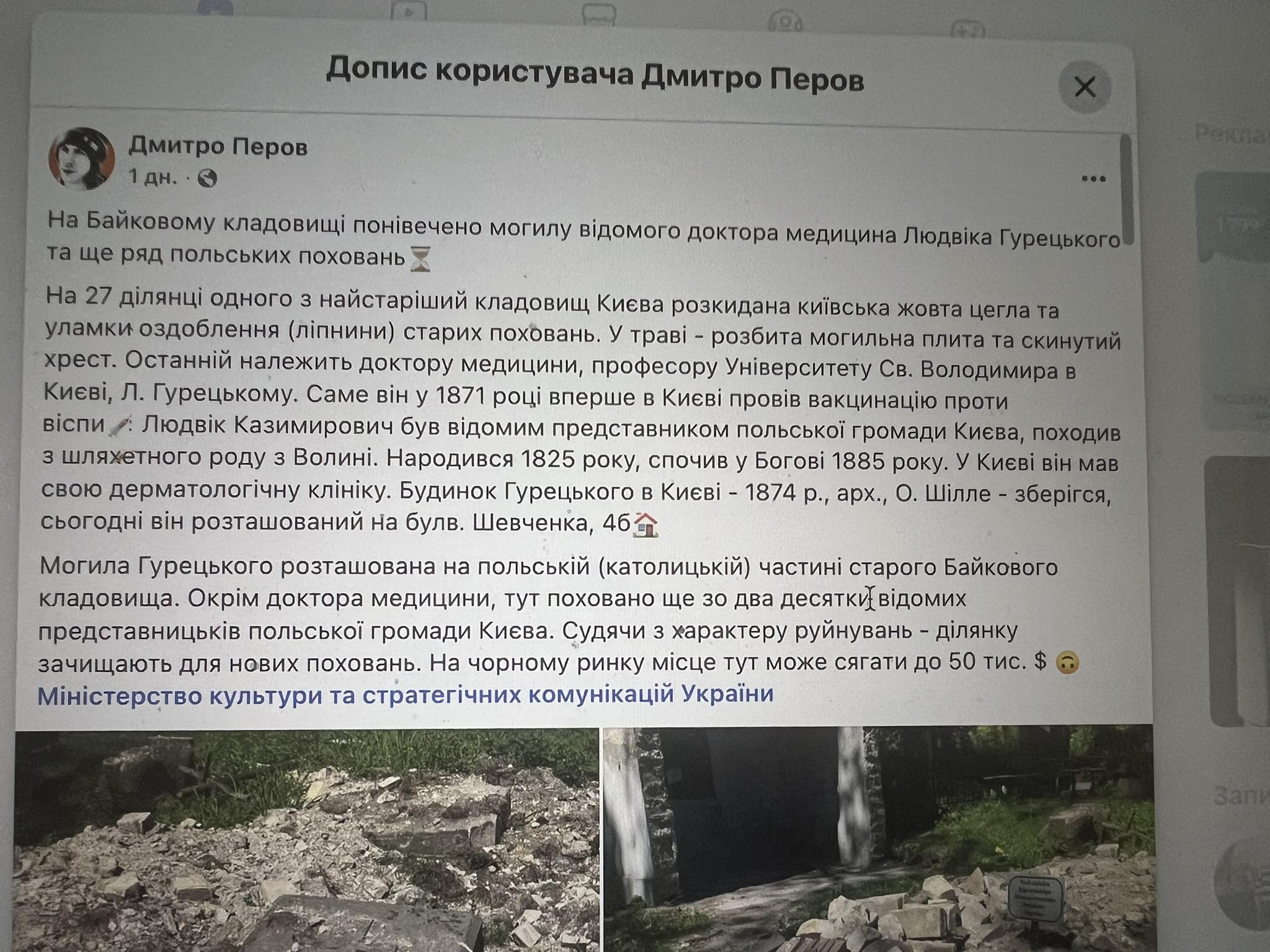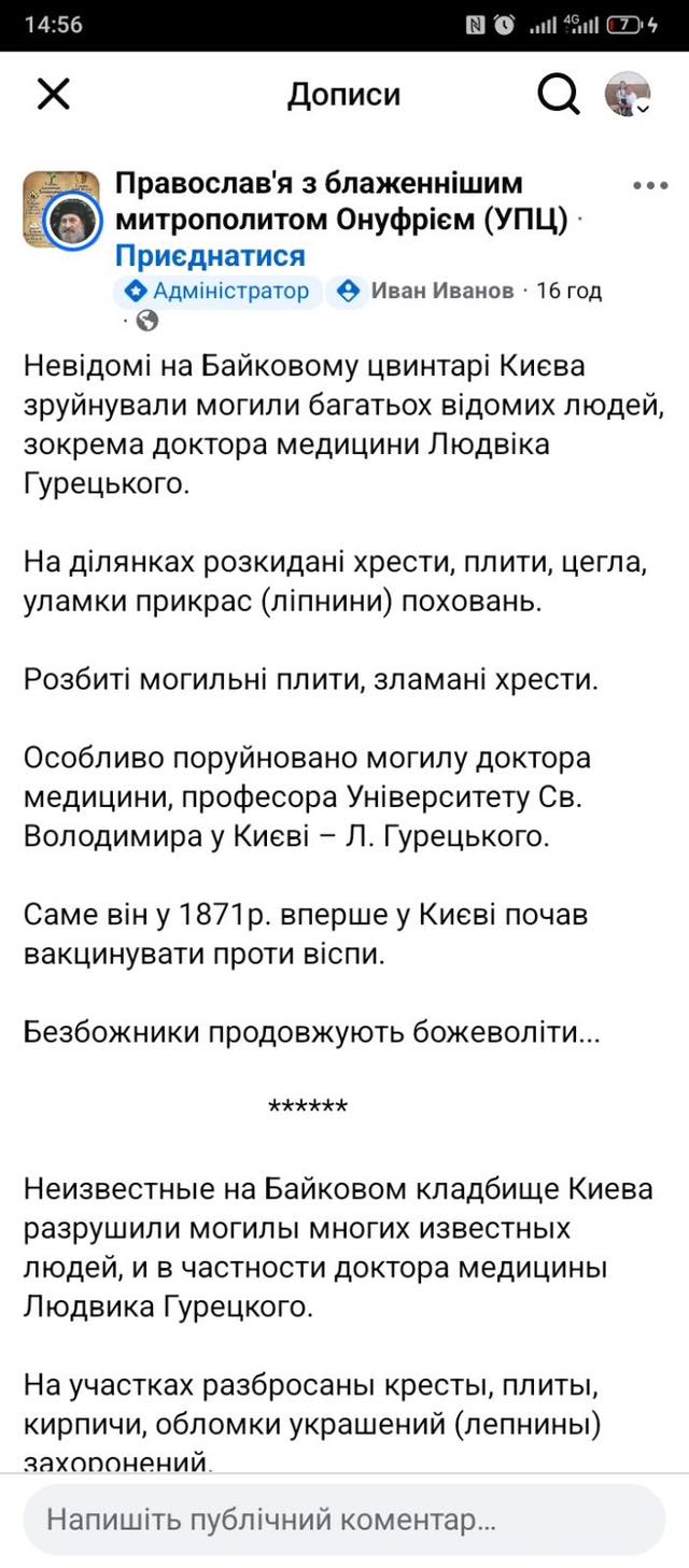 Римсько-католицька парафія Святого Миколая у Києві спростувала інформацію про нібито руйнування польських поховань на Байковому кладовищі. Раніше в деяких медіа та соцмережах з'явилися повідомлення про знищення могили відомого лікаря та професора Університету св. Володимира Людвіка Гурецького. Про це повідомляє «Главком» із посиланняи на офіційний пресреліз парафії.