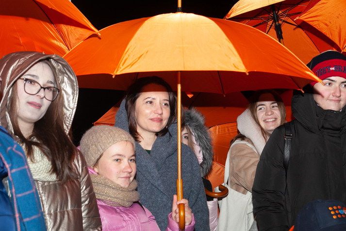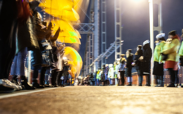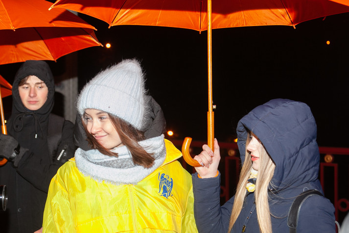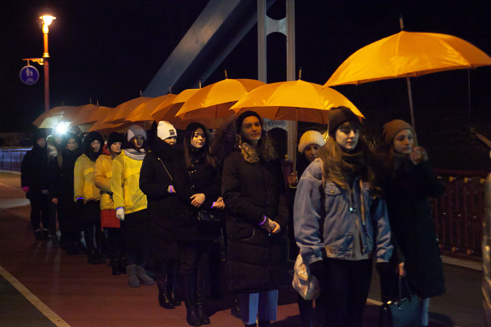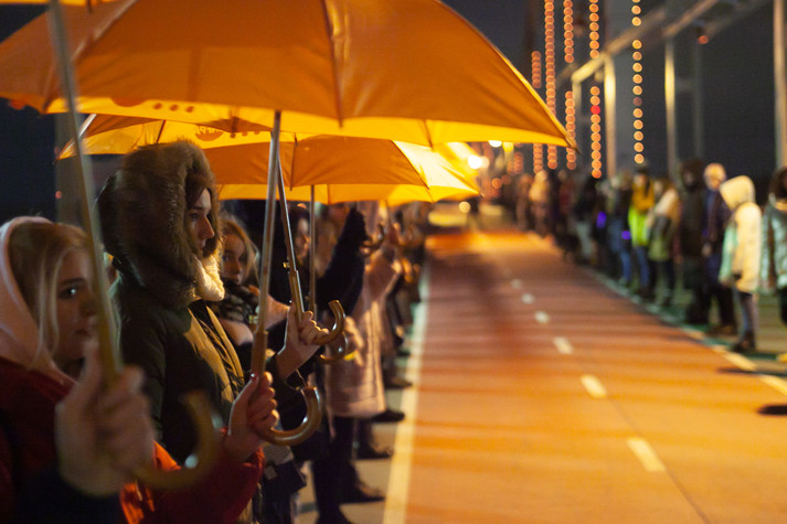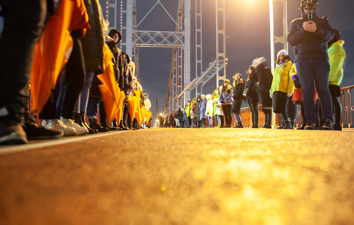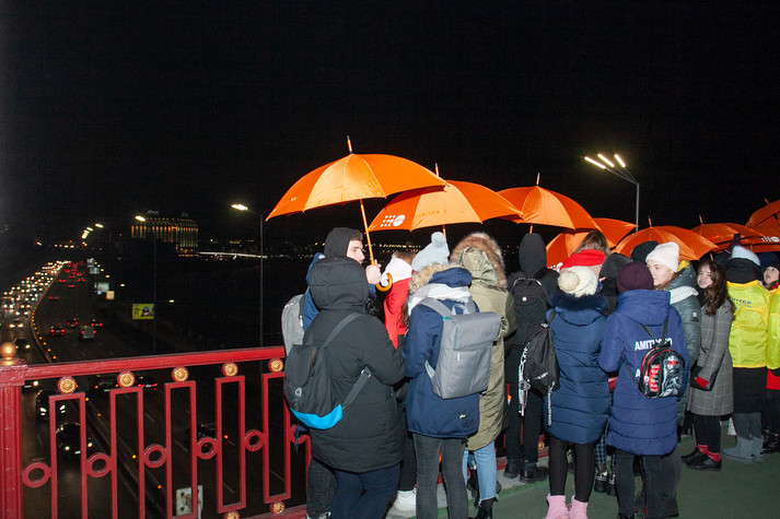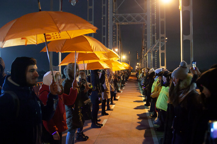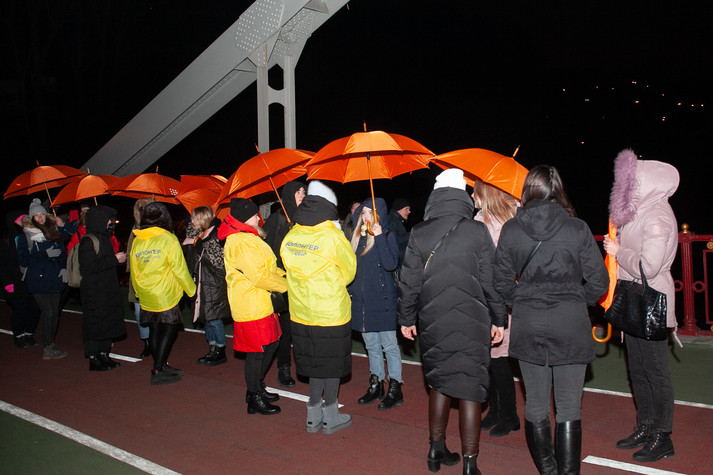 Підсвічування мосту помаранчевим кольором, а також флешмоб із парасольками помаранчевого кольору під гаслом «Розірви коло насильства» є інтерактивною частиною акції «16 днів проти насильства». Мета акції – привернути увагу громадськості до питань запобігання та протидії гендерному насильству.