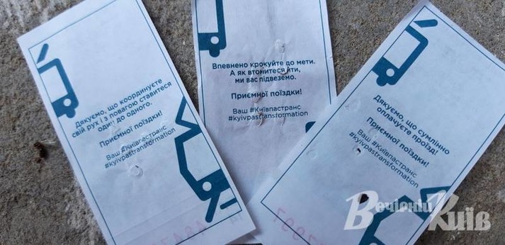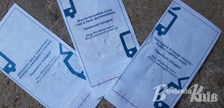 На зворотному боці талонів на проїзд у столичному громадському транспорті з'явилися різні цікаві написи. Таким чином комунальне підприємство «Київпастранс» дякує пасажирам за оплату проїзду.