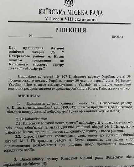 Київська міська держадміністрація планує приєднати Дитячу клінічну лікарню №7 до Київського міського центру дитячої нейрохірургії. Відповідний проект рішення оприлюднила на своїй сторінці у Facebook представниця дитячої лікарні Лілія Сердюк.