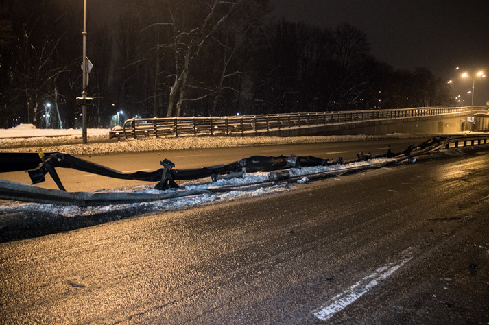 У понеділок, 28 січня, ввечері в Києві на Набережному шосе сталася аварія: вантажівка МАЗ знесла розмежувальну огорожу і врізалася в Nissan Qashqai.