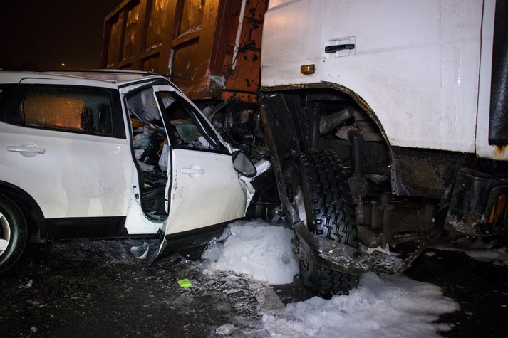 За попередньою інформацією, водій вантажівки МАЗ не впорався з керуванням, зніс огорожу і виїхав на зустрічну смугу. Через високу швидкість машина не зупинилася і врізалася в Nissan Qashqai, повністю роздавивши передню частину «японця» і частково пошкодивши салон. На щастя, дівчина-водій Nissan тільки пошкодила руку. Водій вантажівки не постраждав.