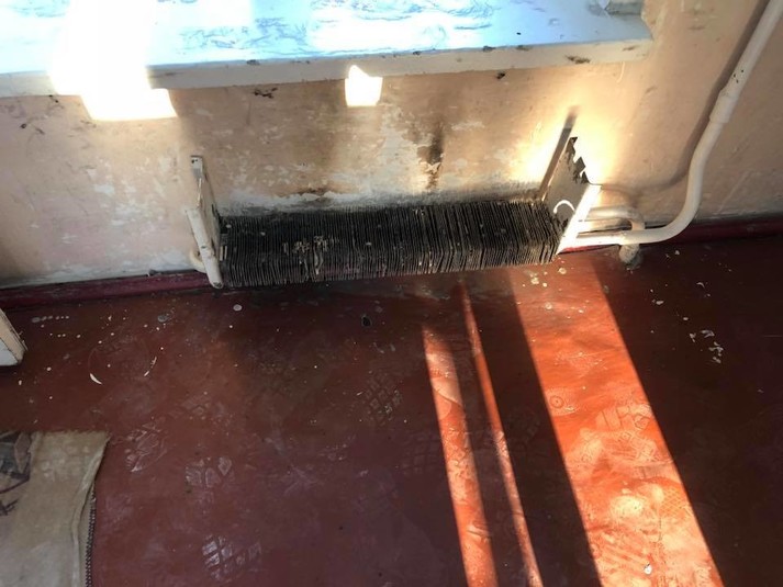 На фотографіях видно облуплені стіни гуртожитку та страшні батареї опалення, що давно потребують заміни.