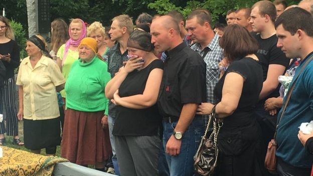 На цвинтарі люди стали навколо труни й мовчки слухали як священник відспівує хлопчика.