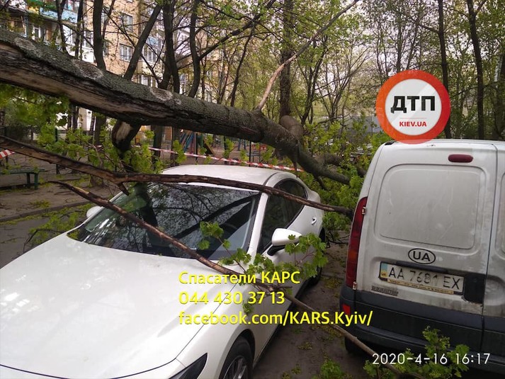 Також на вулиці Солом'янській вітер повалив дерево на автомобіль. На місці працюють рятувальники.