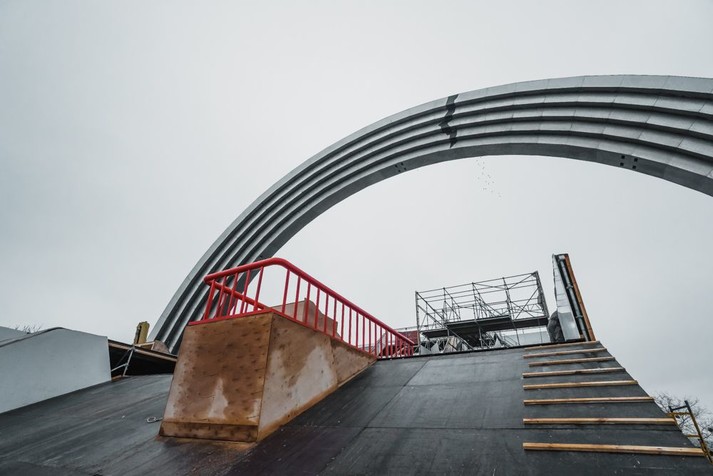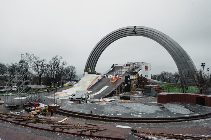 У Києві під Аркою дружби народів більше тижня триває будівництво одного з найбільших міських сноупарків Європи, де цими вихідними відбудуться другі міжнародні змагання для професійних сноубордистів і лижників «Дабл Тріпл Snow Fest 2020».