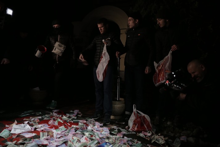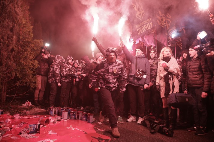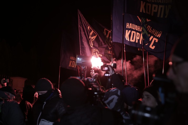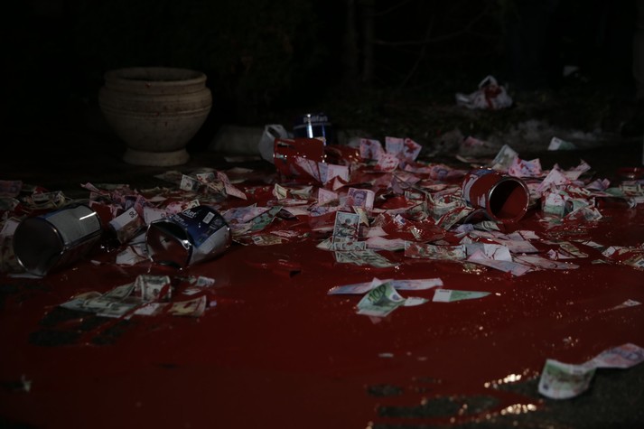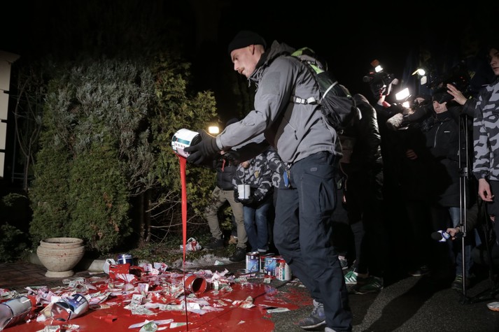 Як повідомляє Радіо Свобода, представники націоналістичних організацій («Національний корпус», «Національні дружини») розкидали перед брамою будинку папірці у вигляді грошей та розлили червону фарбу як «символ крові».