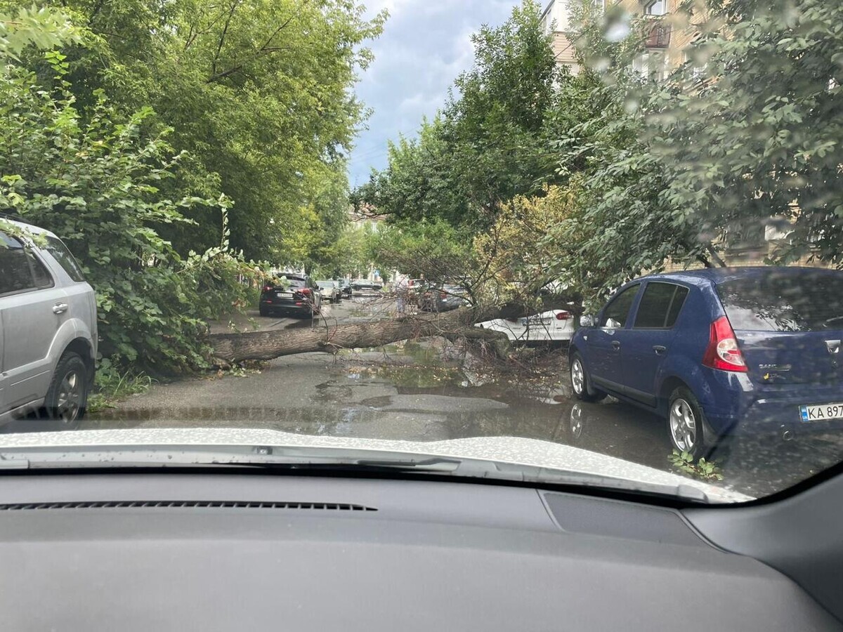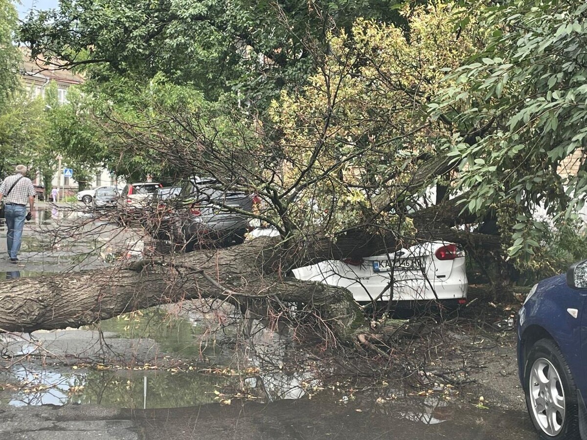 Аналогічна ситуація сталась на вулиці Чорнобильській у Святошинському районі, де дерево впало на припарковані автівки. На місці працює поліція. За попередньою інформацією, ніхто з людей не постраждав.
