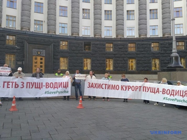 Вони тримають великі плакати «Захистимо курорт Пуща-Водиця», «Київміськбуд, геть з Пущі-Водиці», повідомляє Укрінформ.