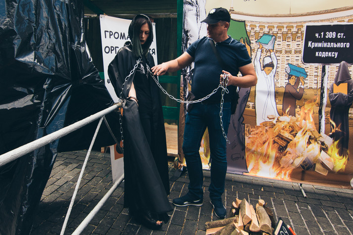 Під час перформансу «інквізитор» в кепці поліцейського приковував «відьму», яка приймає наркотики, наручниками до огорожі, обв'язував її ланцюгами і «спалював» на імпровізованому багатті. Потім учасники збирали підписи-хрестики під «петицією». В результаті дівчину-актрису звільнили, що, за задумом організаторів акції, має означати зміну законодавства на їх користь.
