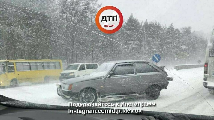 Через сильний снігопад на в’їздах до столиці величезні затори. У столиці зупинився рух на лінії швидкісного трамвая. На Святошино сталася масштабна ДТП.