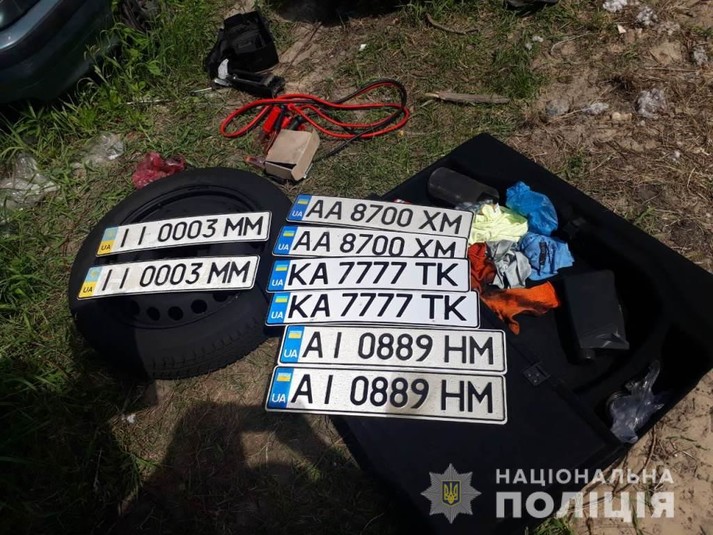 Пошкоджений автомобіль, на якому держномери не відповідали дійсності, поміщено на майданчик тимчасового тримання у якості речового доказу. При проведенні невідкладного огляду транспортного засобу поліцейські вилучили з багажного відділення ще 4 пари різних держномерів.