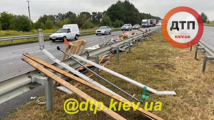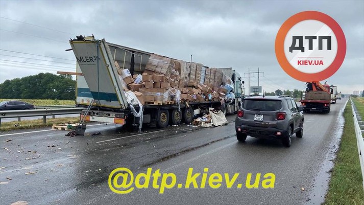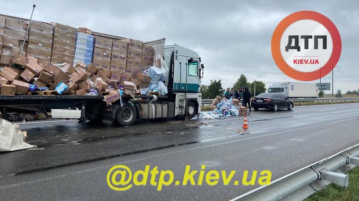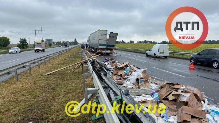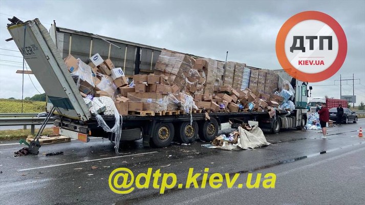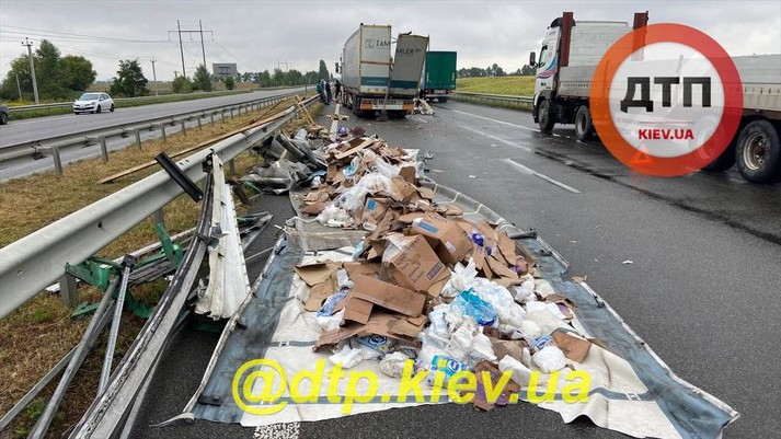 Під Києвом не розминулися дві вантажівки, багаж розкидано по всій дорозі (фото)