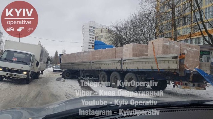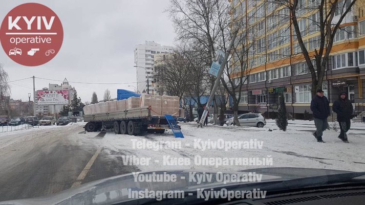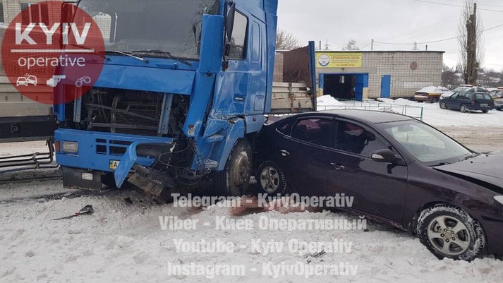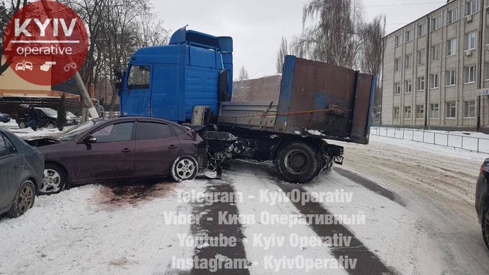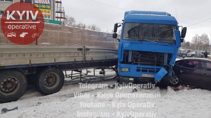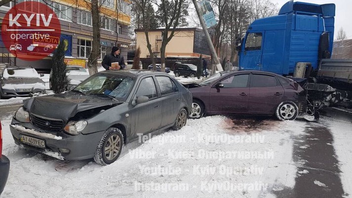 «За попередньою інформацією, водій вантажівки (AA3529KX) не впорався із керуванням, авто почало заносити, а потім взагалі «заламало». Вже у заламаному стані фуру відкинуло у припарковані автомобілі та стовп», - йдеться в повідомленні.