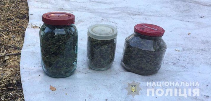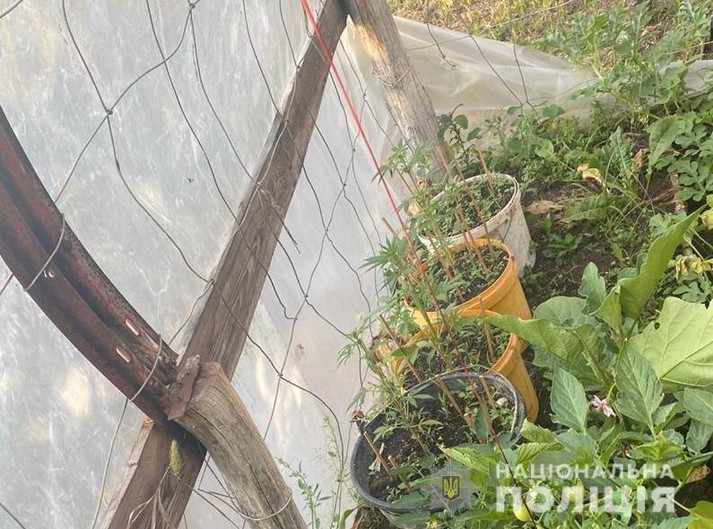 На території домоволодіння поліцейські виявили та вилучили кущі конопель, а також банки та пакет із сушеними наркотичними рослинами.