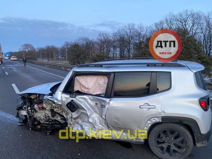 Інцидент стався на окружній Борисполя – водій Jeep Renegade здійснював обгін, який не завершився успіхом. Він протаранив легковий автомобіль і врізався у вантажівку з цистерною для перевезення газу.