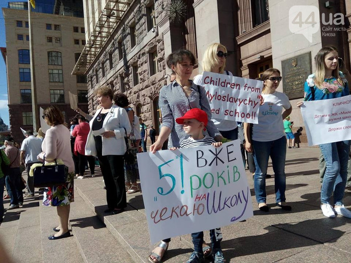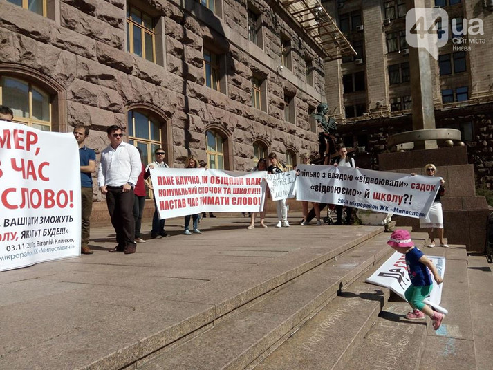 На першому мітингу активісти вимагають від мера Віталія Кличка виконати дану рік тому обіцянку - побудувати комунальний дитячий сад в ЖК «Мірославичі» на Троєщині. Про це повідомляє 44.ua.