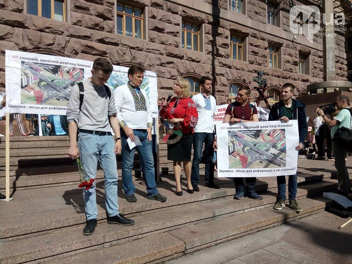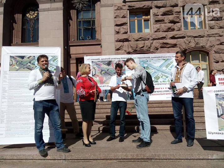 Також паралельно проходить мітинг людей, що підтримують автора альтернативного проекту трирівневої Шулявської розв'язки Віктора Петрука. Учасники акції вимагають прозорого конкурсу з вибору кращого проектного рішення Шулявської розв'язки. Також вони виступають проти будівництва на Шулявці моста- чотирилистяника, який, на їхню думку, не поліпшить там транспортну систему. За словами автора альтернативного проекту моста, зараз затверджений проект є майже аналогом сучасного шляхопроводу.