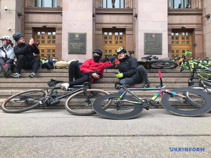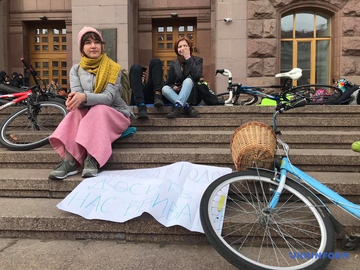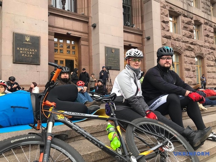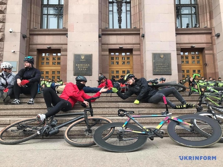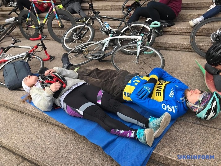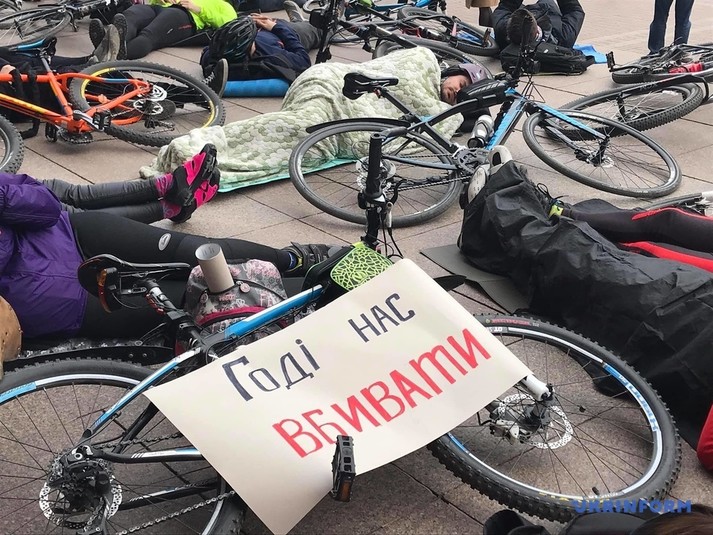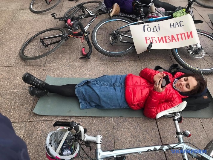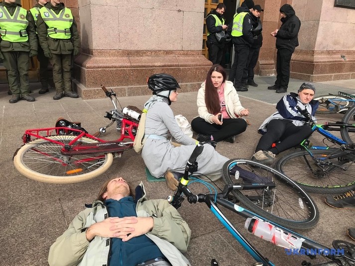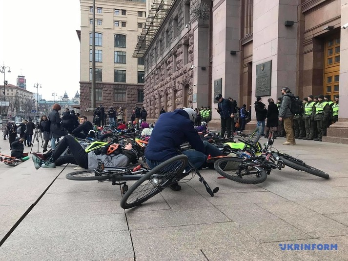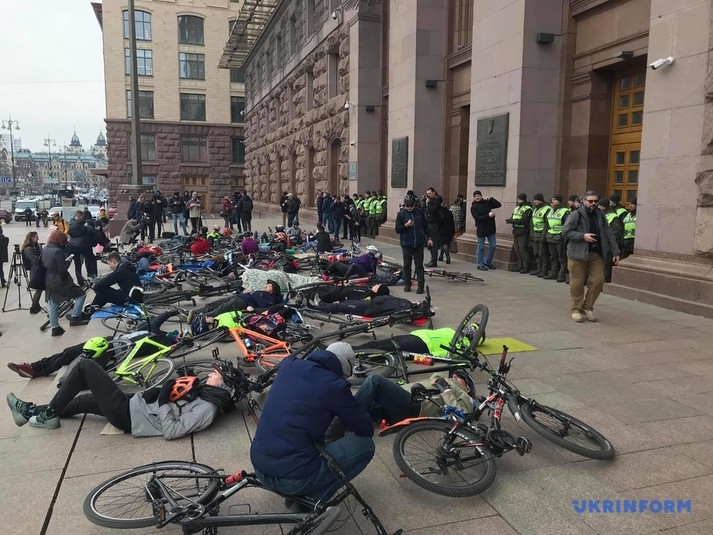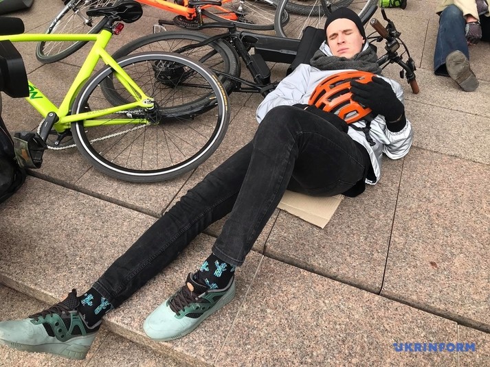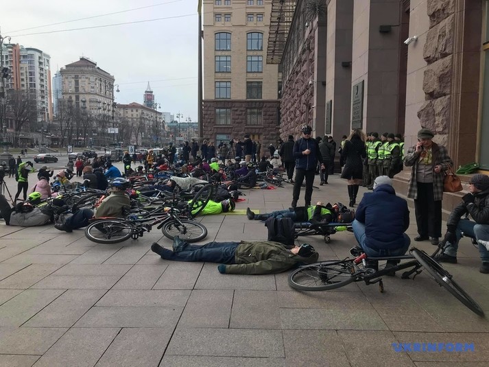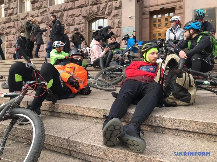 Десятки людей лягли поряд зі своїми велосипедами на сходах біля столичної мерії.