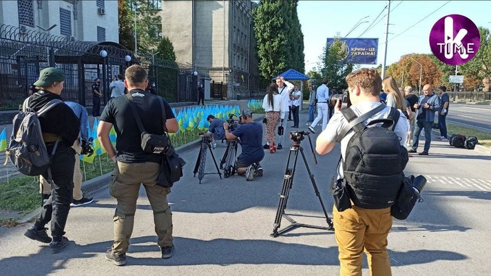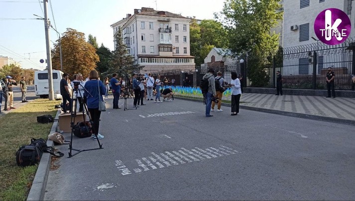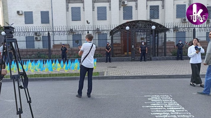 Під посольством Росії у Києві встановили 150 прапорів України (фото)