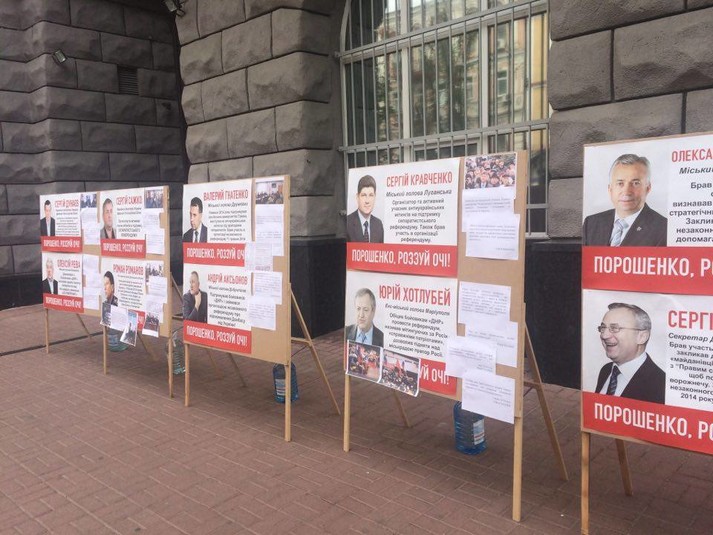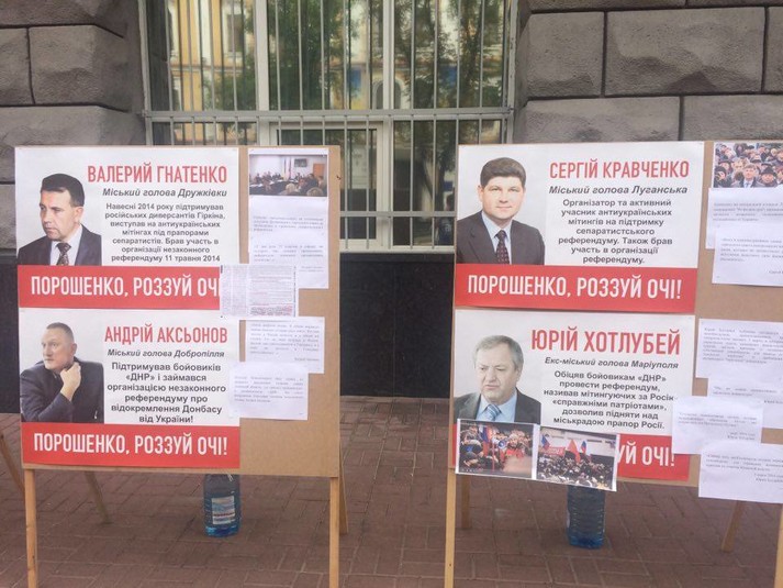 На портретах - чиновники, міські голови і високопоставлені силовики, які сприяли розгортанню війни і сепаратизм на Донбас.