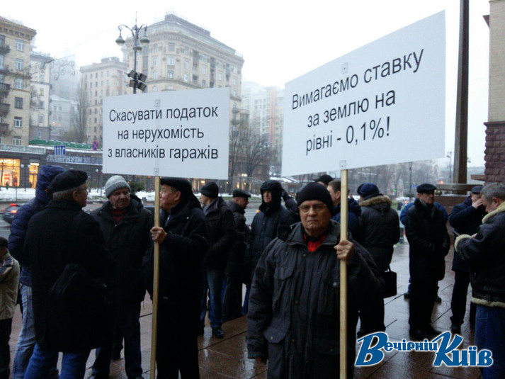 Сьогодні, 31 січня, вранці біля Київської міської ради проходить мітинг. Тут зібралися кілька десятків людей. Вони вимагають знизити ставку на землю, а також скасувати податок на нерухомість з власників гаражів.