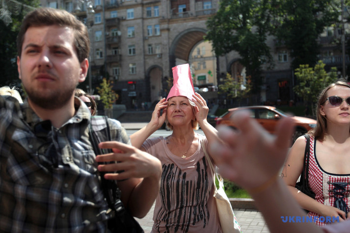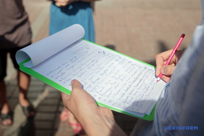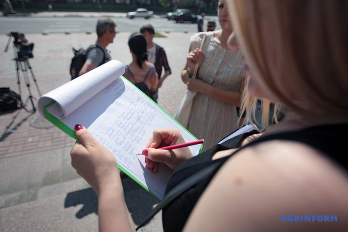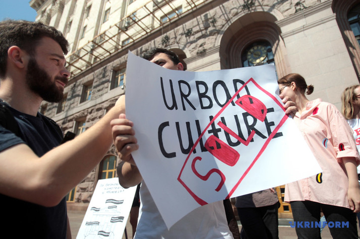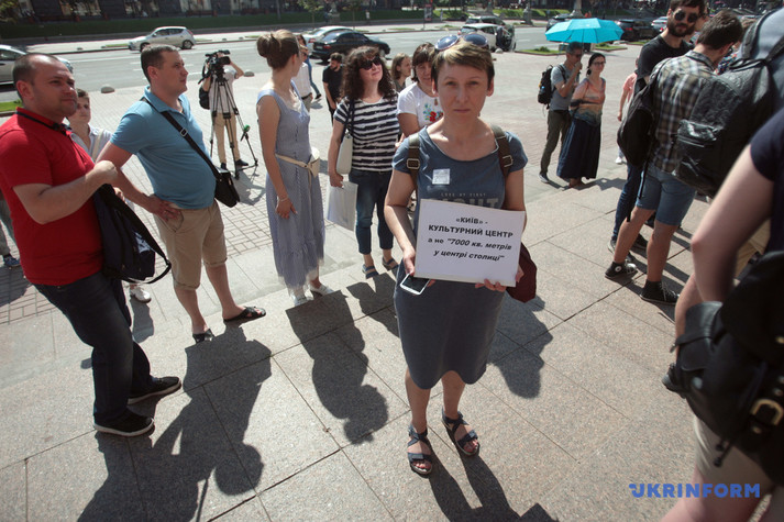 На акцію прийшли активісти, які представляють ініціативу «Врятуємо КЦ «Кінотеатр «Київ». Учасники акції тримають плакати «За безкоштовний кінотеатр у «Києві», «Київ» - культурний центр, а не 7000 кв. метрів у центрі столиці» та скандують «Ганьба», «Руки геть від культури!». Про це повідомляє Укрінформ.