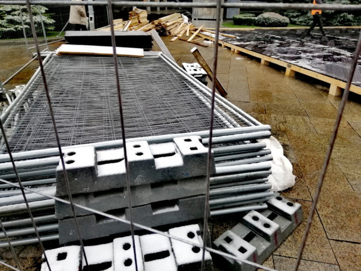 Локація, де почали закладати фундамент ковзанки, огороджена сіткою – тут охайно складені свіжі дерев’яні дошки. З інших деталей – частини металевої огорожі, що стоятиме по периметру ковзанки.