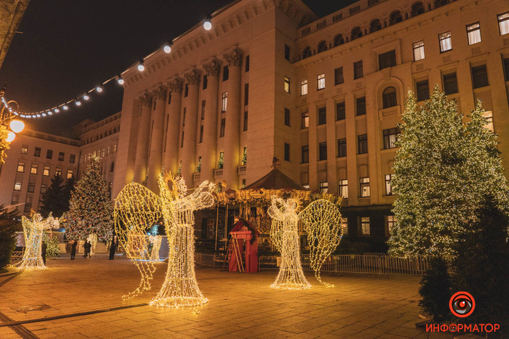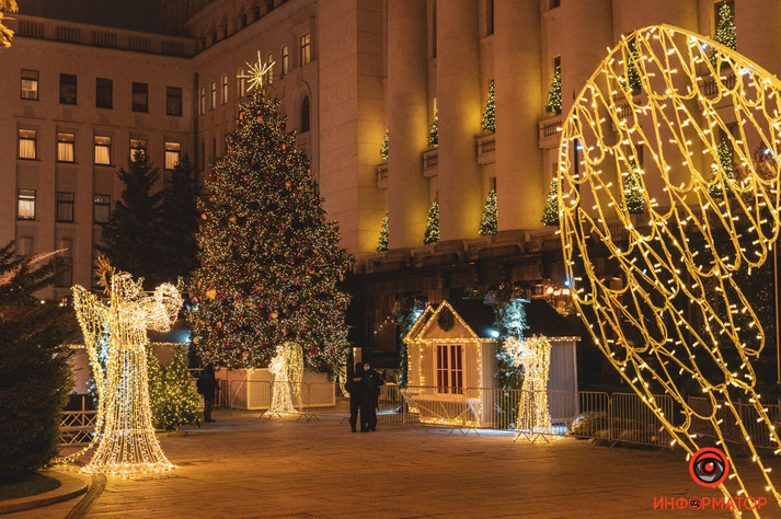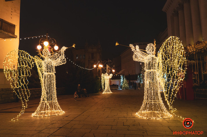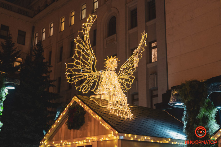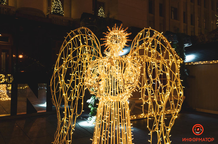 Площу прикрасили сяючими ангелами, як і минулого року. Їх можна побачити на входах у локацію та на дахах будинків.