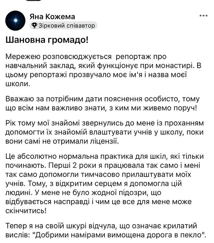 Кожема розповіла, що просто «допомогла знайомій прилаштувати учнів у школу, поки вони самі не отримали ліцензії». Директорка називає це «абсолютно нормальною практикою для шкіл, які тільки починають». Зараз сторінка педагогині у соцмережах заблокована.