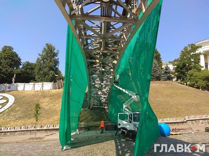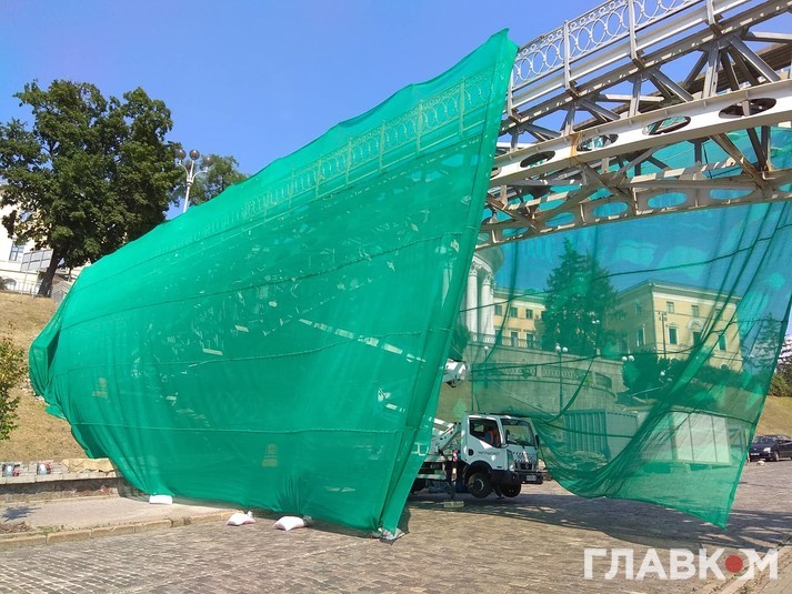 Наразі комунальники затягують міст спеціальною сіткою, повідомляє кореспондент «Главкома».