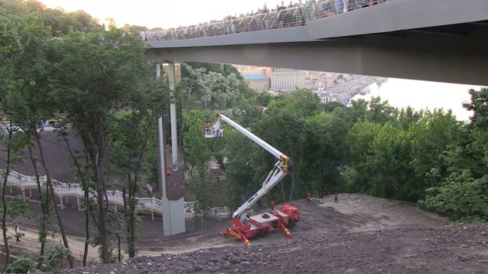 Як повідомлялось, у День Києва, 26 травня, на новому пішохідно-велосипедний мосту між аркою Дружби народів і парк «Володимирська гірка», який відкрили напередодні ввечері в подарунок киянам, тріснуло скло на одному з оглядових майданчиків. Всіх людей екстрено евакуювали з мосту.