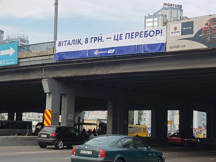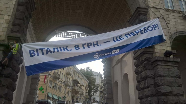 У вівторок, 17 липня, вранці в Києві з’явилися розтяжки з критикою рішення столичної влади щодо підвищення цін на проїзд у громадському транспорті. На горизонтальних банерах написано «Віталік, 8 грн - це перебор».