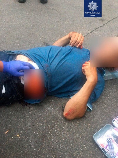 У цей час, поліцейським надійшов виклик про тілесні ушкодження. Співробітники охоронного холдингу виявили чоловіка з проникаючим ножовим пораненням, який лежав на землі. Вони надали йому першу домедичну допомогу і викликали медиків. Потерпілий описав свого кривдника, опис збігався з тим чоловіком, якого зупинили патрульні раніше.