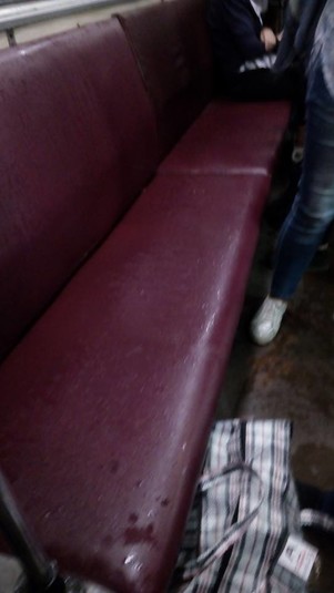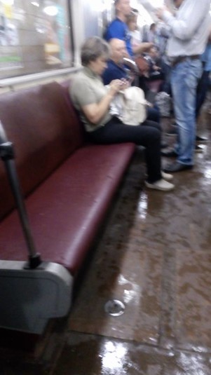 «На «Театральній» скористався пристроєм «пасажир-машиніст». На Політехнічний в вагон зайшла співробітниця станції, оцінила потоп на око. Сказала, що так у всіх вагонах. Негода, потерпіть...», - розповів він і оприлюднив фото вагона метро, в якому на сидіннях і підлозі калюжі.