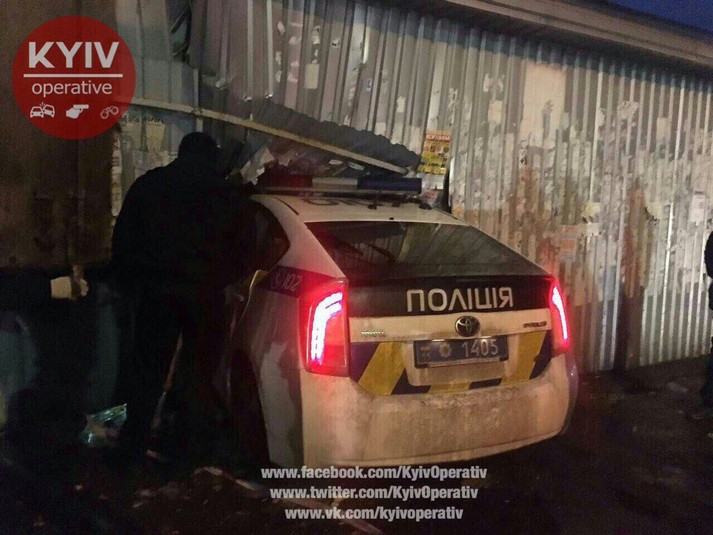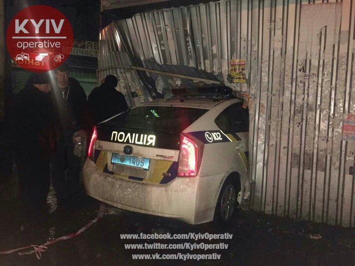 За попередніми даними, поліцейський Toyota Prius врізався в хлібобулочний кіоск на Деміївському ринку. На щастя, в магазині нікого в той момент не було. Обійшлося без постраждалих. Обставини ДТП з'ясовуються.