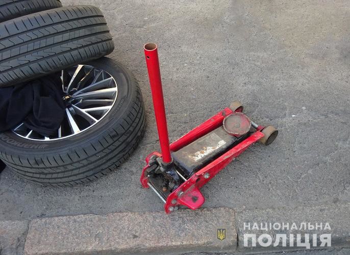 Правоохоронці встановили, що чоловіки за допомогою спеціальних інструментів демонтували чотири колеса з автомобіля «Хюндай» та поклали їх до власної автівки. Під час невідкладного обшуку слідчі вилучили речові докази, серед яких домкрат та інші приладдя для шиномонтажу.